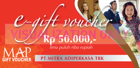 MAP e-Gift Voucher Rp50.000 is the digital/electronic version of the physical (paper) MAP Gift Voucher, the official gift voucher from PT Mitra Adiperkasa Tbk and the leading lifestyle gift voucher in Indonesia.